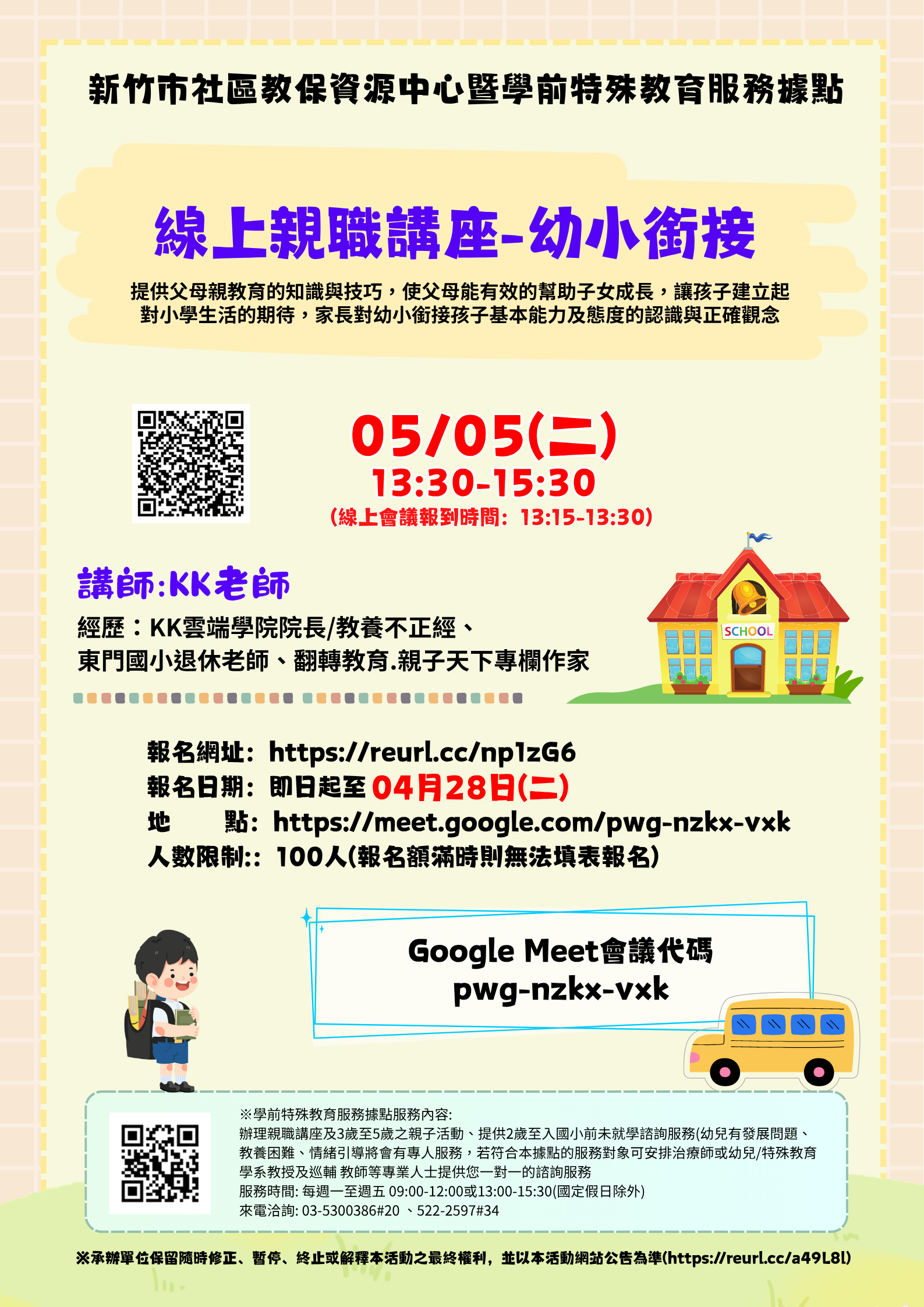 由KK老師提供父母親教育的知識與技巧,使父母能有效的幫助子女成長,以及讓孩子建立起對小學生活的期待,並提供家長對幼小銜接孩子基本能力及態度的認識。